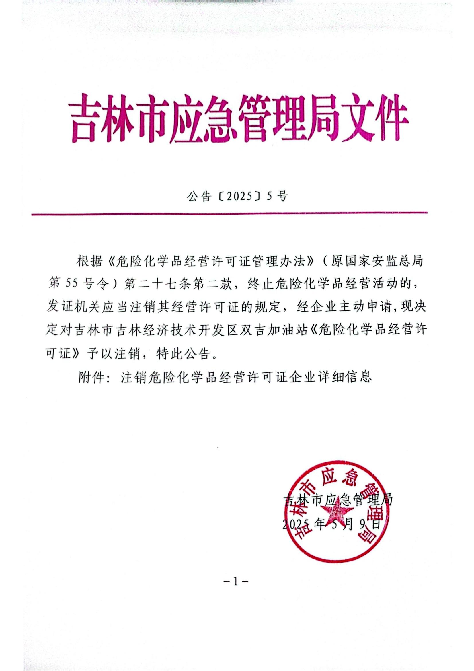 吉林市应急管理局文件 公告〔2025〕5号